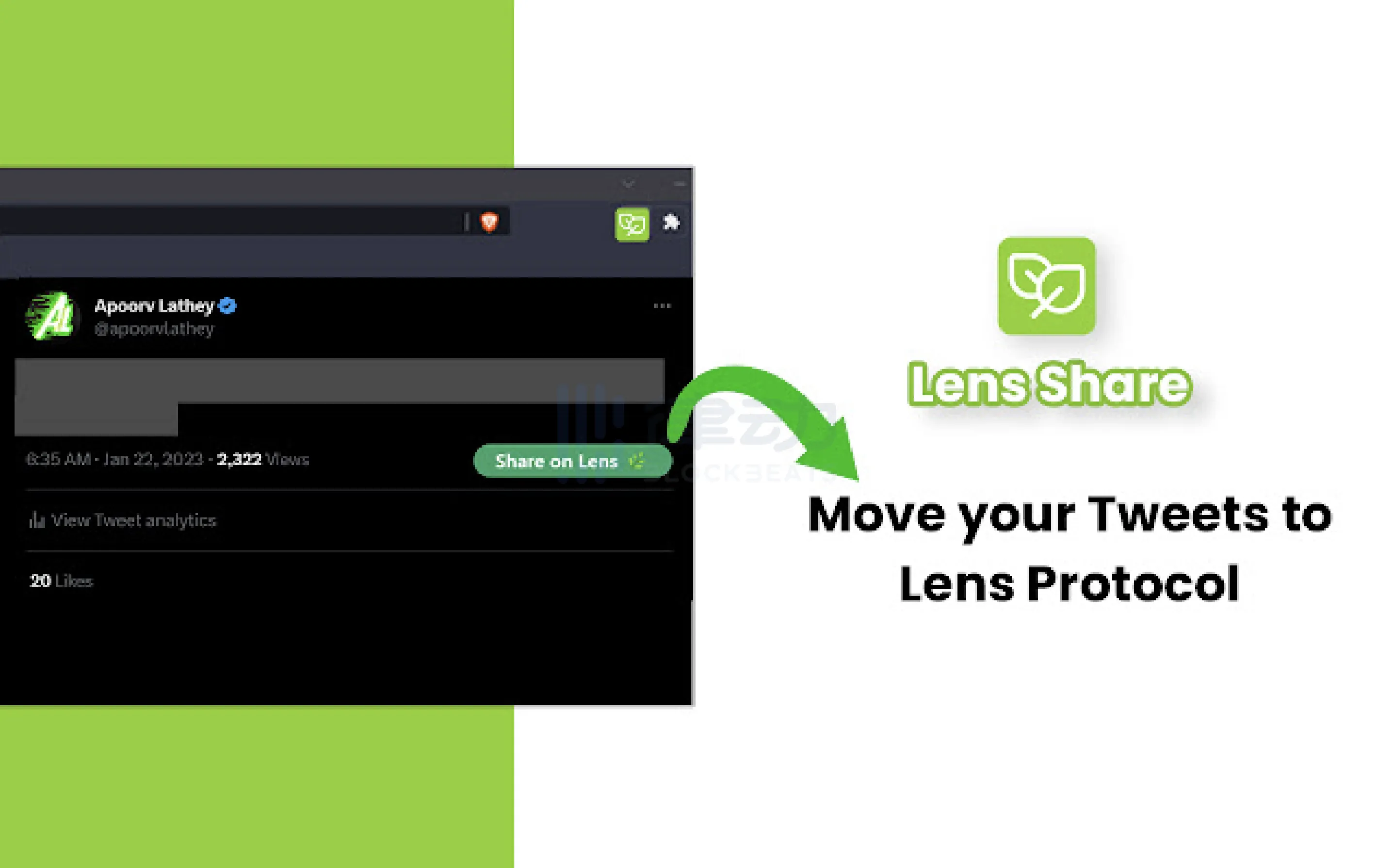 由 @apoorvlathey 发布的 Lens Share 浏览器插件,可以直接搬运 tweet 到 Lens,Lens Share 添加了一个按钮,当用户打开推文时,推文中的文本和图像会在后台自动上传到 IPFS,用户只需在钱包中签署消息并批准 txn 即可将其发布到 Lens Protocol,另外还可以在发布前设置自定义收藏设置,实现将已经发布的推文并将其交叉发布到镜头。
