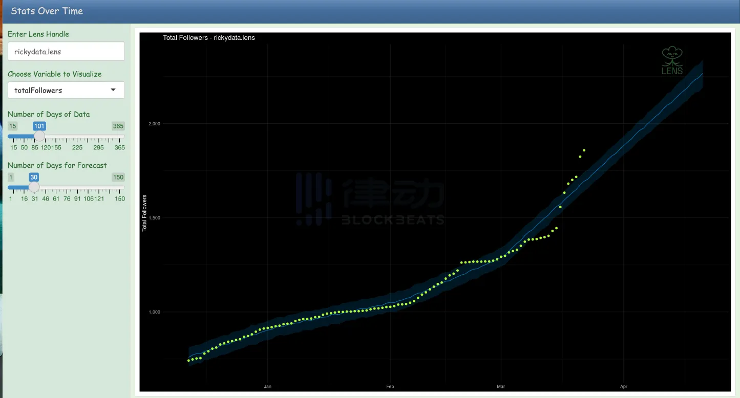 另外,edgeandnode 的数据科学家 rickydata 也基于 Big Query 做了一个预测未来数据的工具,可以根据用户的 Lens handle 过去数据预测粉丝增长量等各个数据的未来情况,目前仅有测试版。