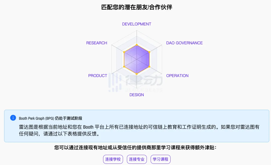 DeSchool 基于 Lens Protocol 的链上简历工具 Booth 目前已经上线,支持一键链接 DeSchool 账号 + Lens 协议,数据互通;找到与共学同一课程的好友和同学,一键关注;基于结课凭证 SBT&Token、学习历程生成链上简历 + 个人能力图谱;根据兴趣,一键匹配好友组队共学。同时,Booth 将会根据当前地址和在 Booth 平台上所有已连接地址的可信链上教育和工作证明生成雷达图。