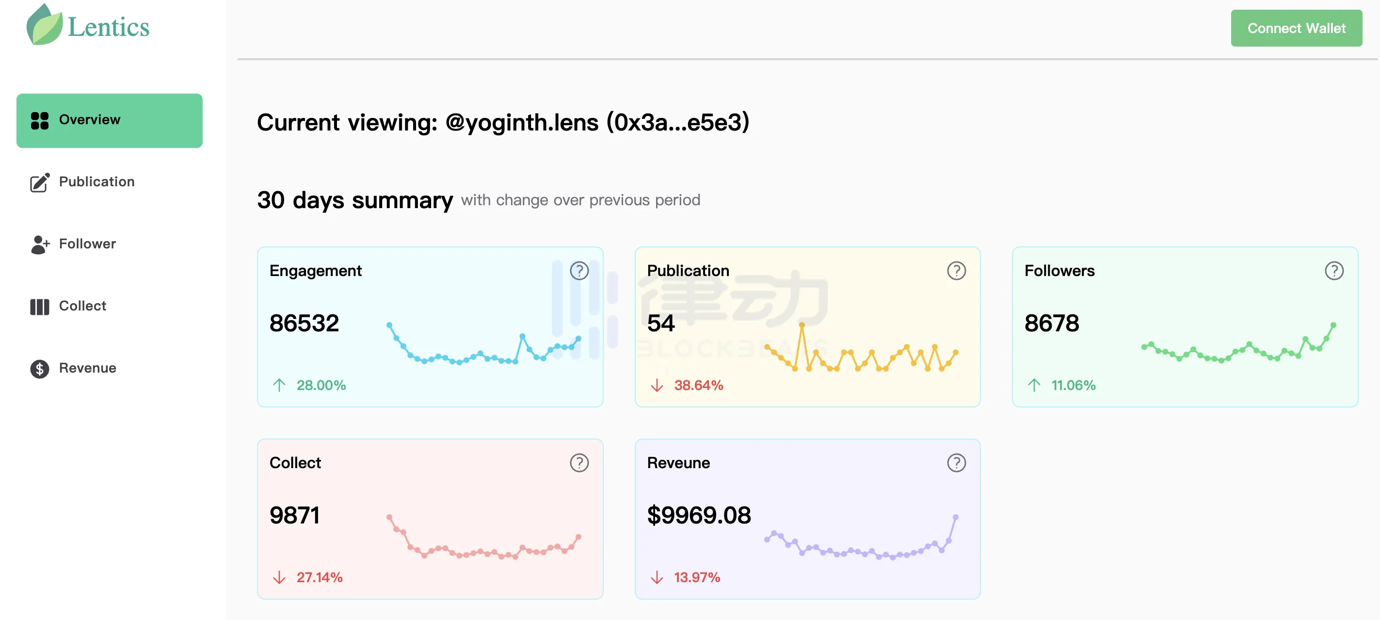 Lentics 是服务 Lens 创作者的分析工具,可分析创作者的粉丝数据、互动、收入等。Lentics 完全集成 Lens,提供了比较完整的数据,帮助创作者分析自己的账号增长。