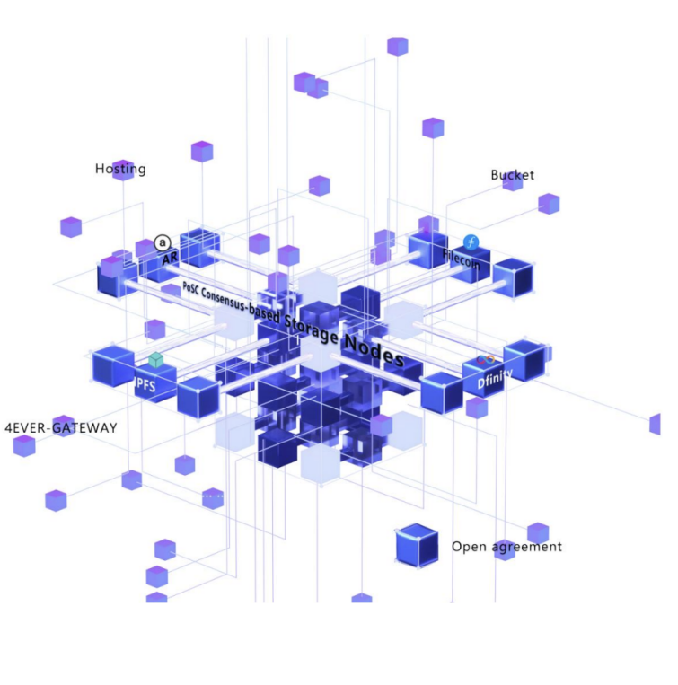 4EVERLAND兼容IPFS等开放协议,利用Swarm技术形成庞大的节点存储网络,依靠节点协作实现特定数据的持久化存储。